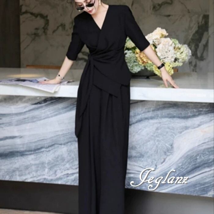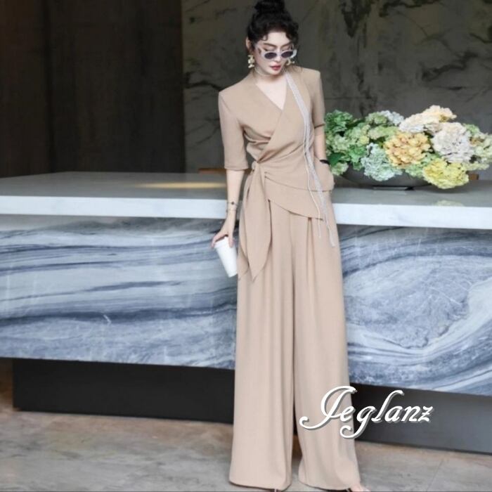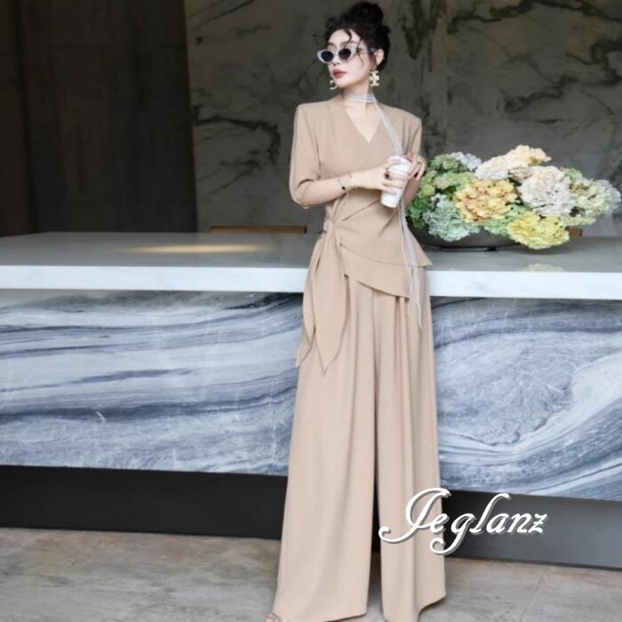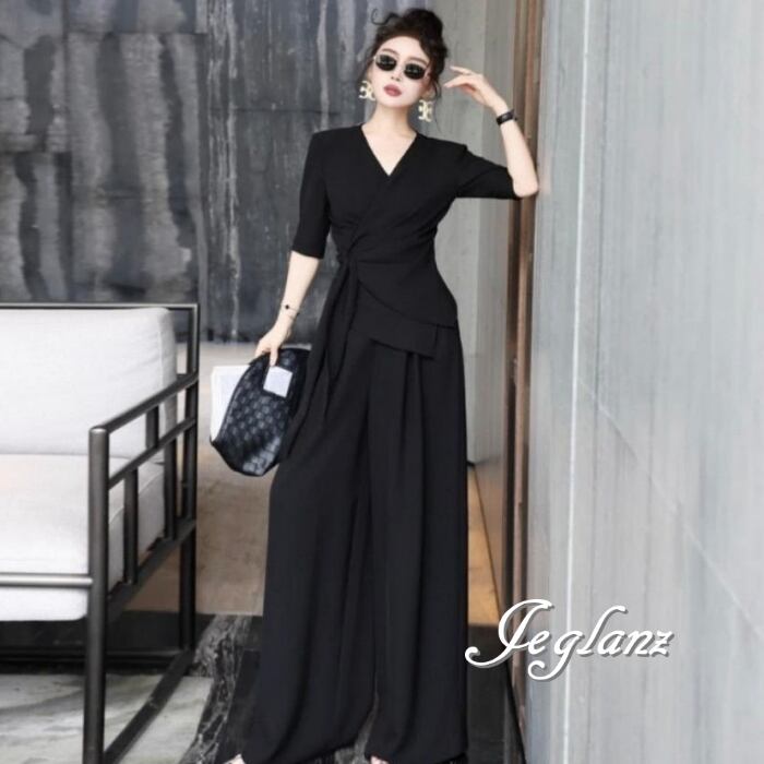 2点セット サイド リボン パンツ スーツ 5分袖 大きいサイズ 2色 (MC071)ζ