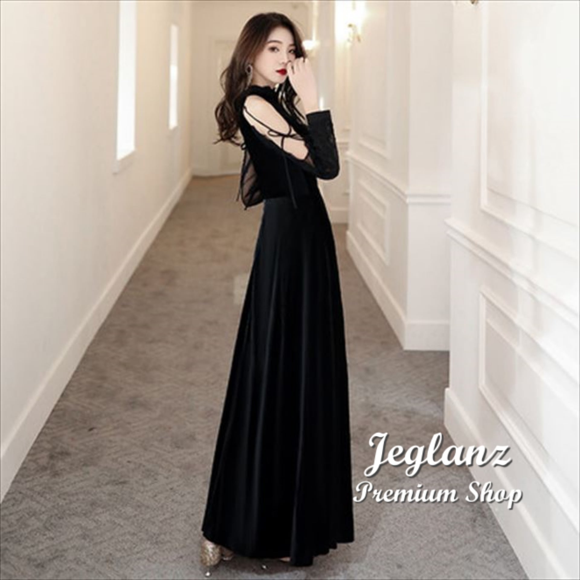 パーティ イブニングドレス ベロア調 オープンショルダー 肌透け レース ♪ (O0312)η