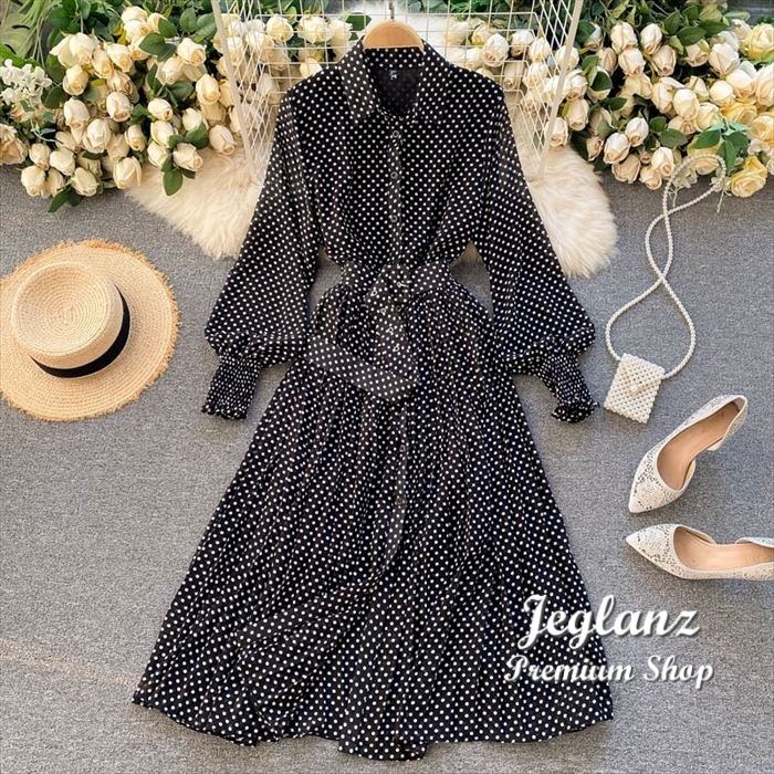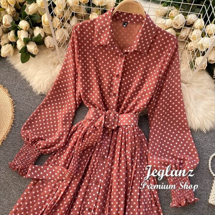 5色 シャツ ワンピース ドレス 水玉 Aライン プリーツ 細見え ♪ (Z1979)γ