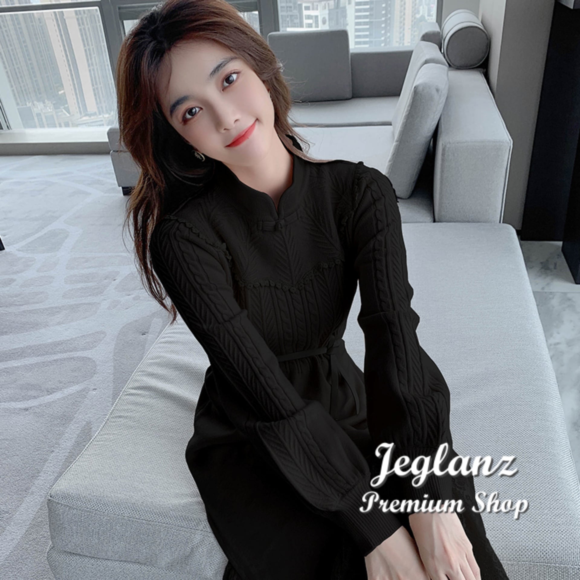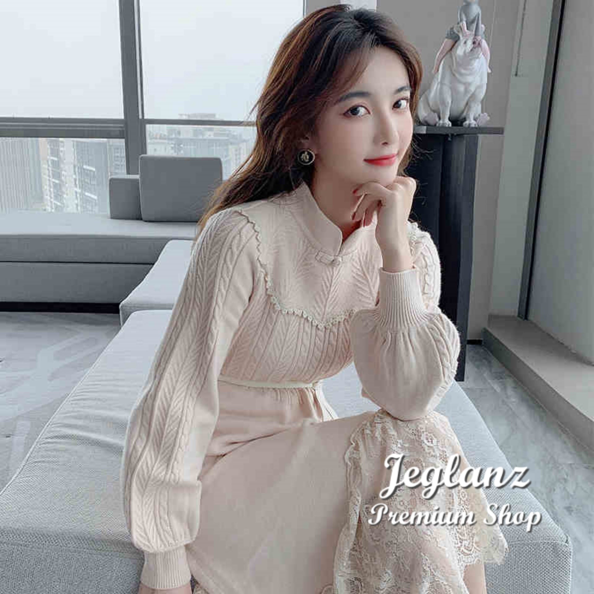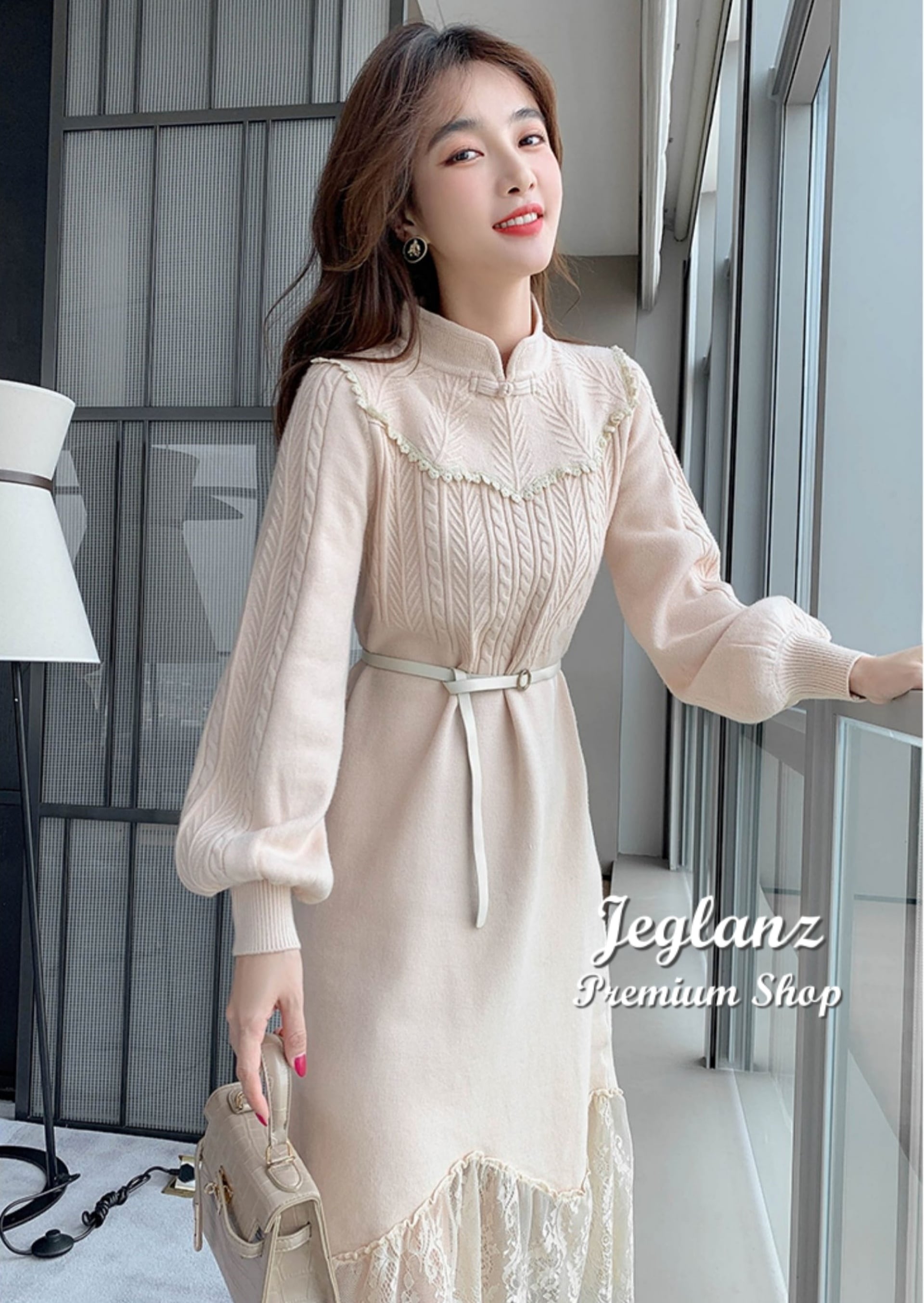 3色 チャイナカラー ニット ワンピース 異素材 ミックス レース ♪ (Z1737)γ