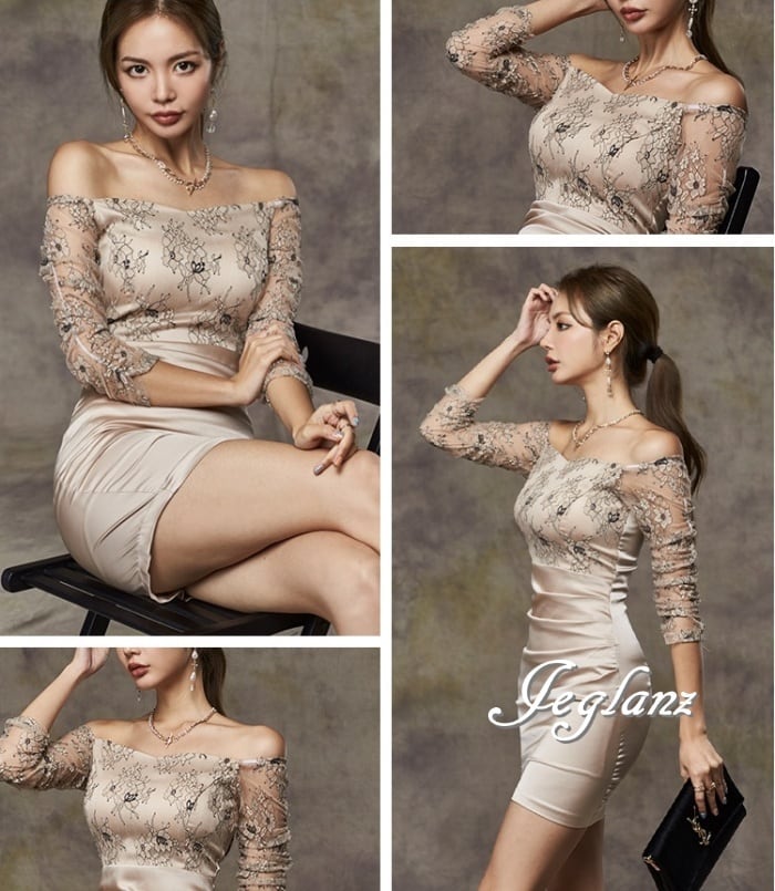パーティ ドレス ワンピース オフショル シアー感 レース ミニ丈 7分袖 ♪(M0471)ζ