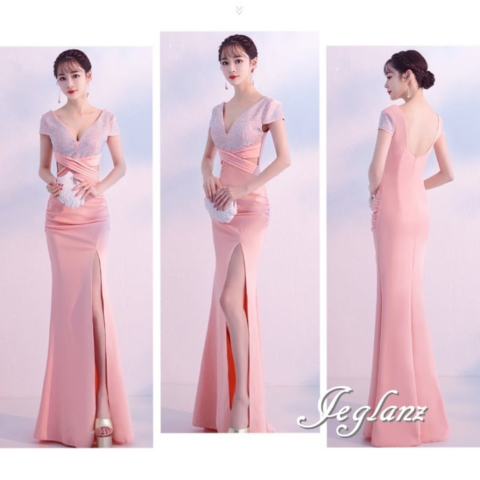 8色 イブニング ドレス カットアウト ビジュー付き ディープ スリット(M0805)ζ