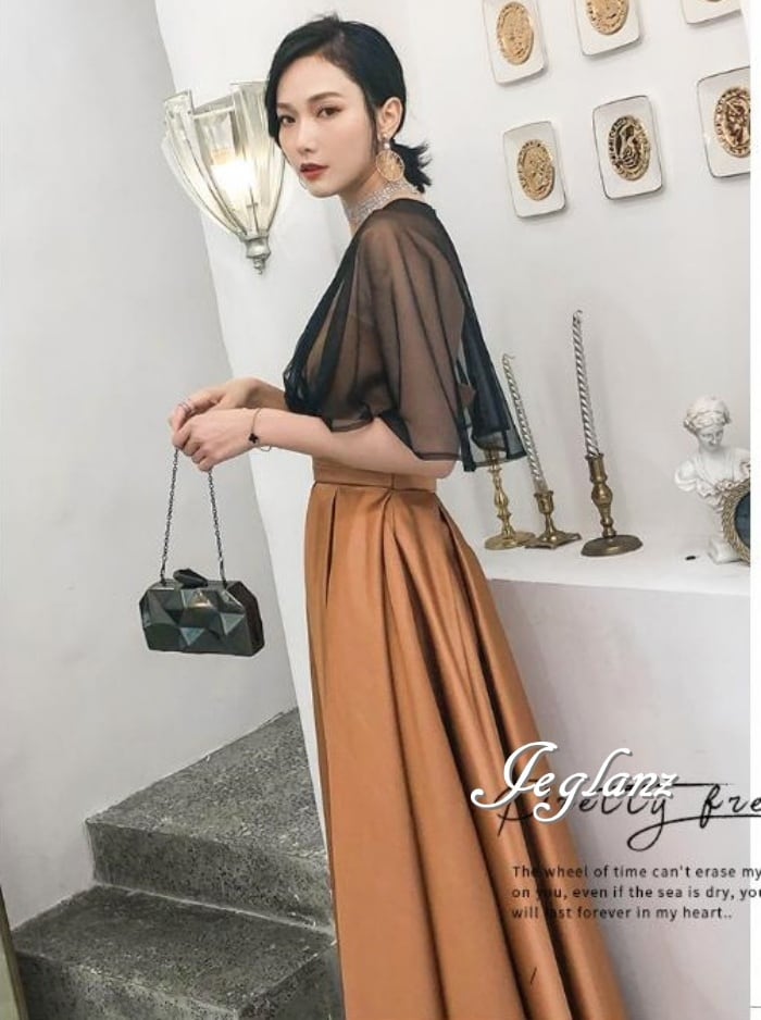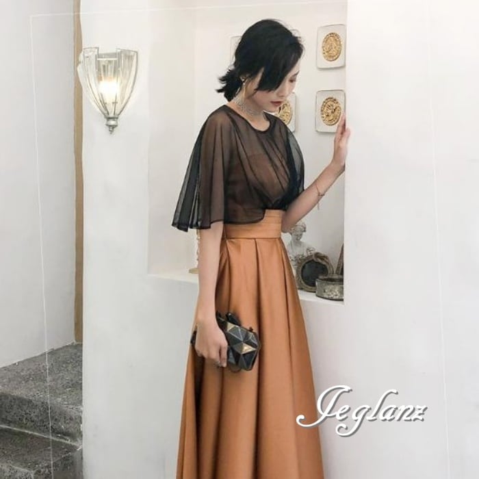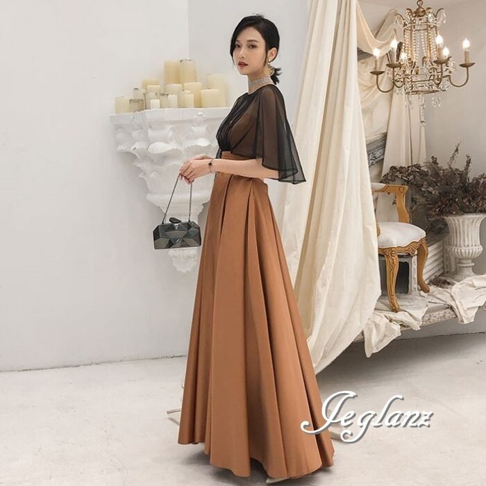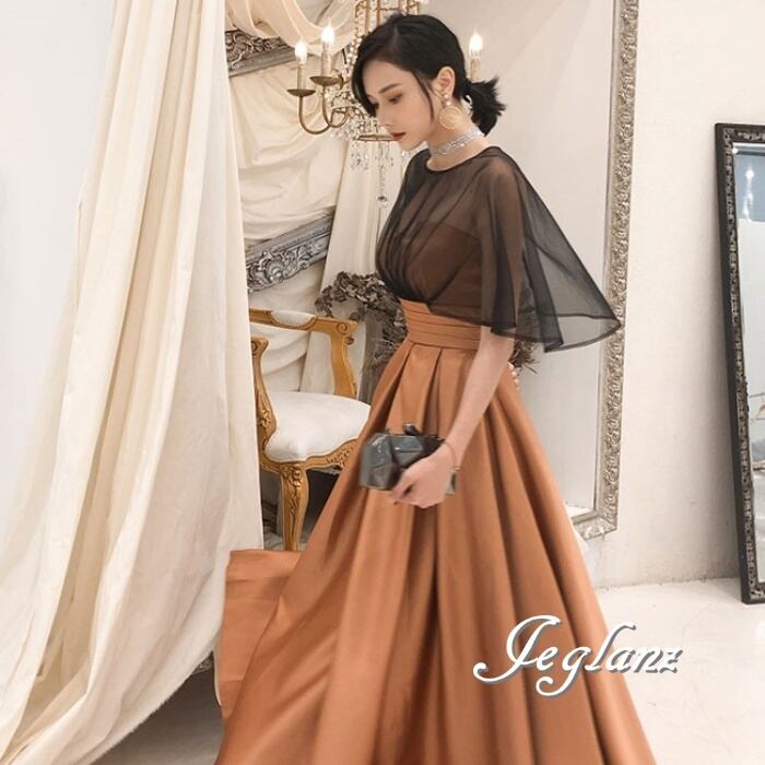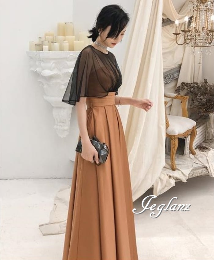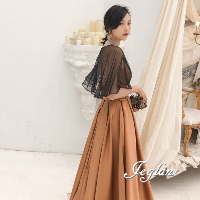 イブニングドレス ベアトップ タック入り 背中 編み上げ ケープ付き シアー感 (M1291)