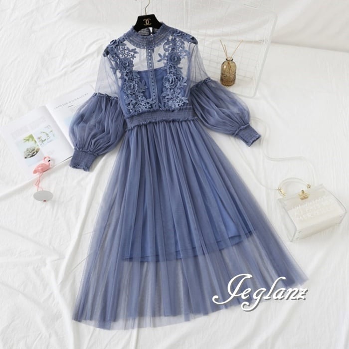 6色 パーティドレス ワンピース レース 切替 アンダードレス付き(M0871)ζ