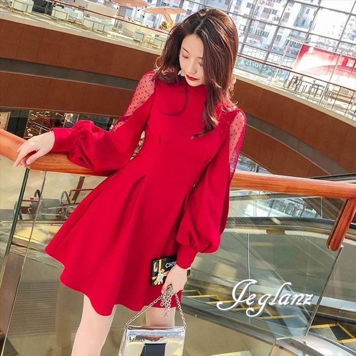 3色 パーティ ドレス 短め丈 ワンピース 水玉 ボリューム袖 背中 リボン(M2503)ζ