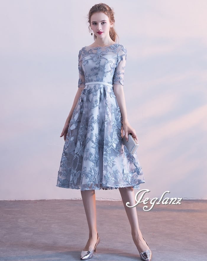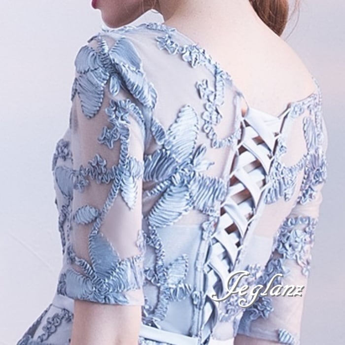 3色 パーティ ドレス ワンピース レース 刺繍 モチーフ 編み上げ 肌透け 5分袖 (Z4063)ζ