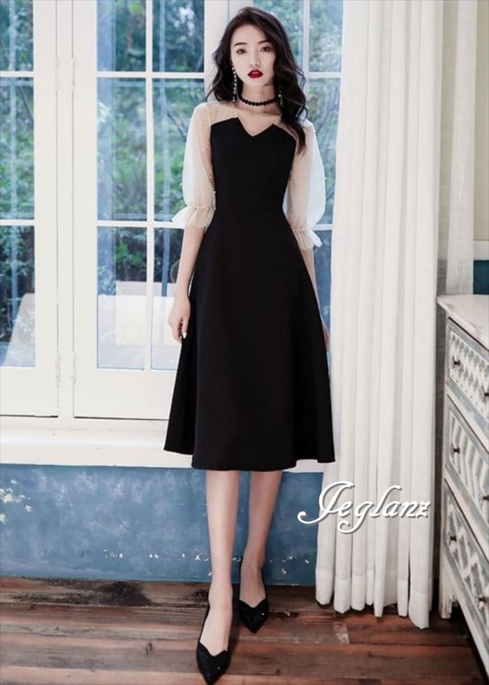パーティドレス ワンピース V開き パール付き 異素材 ミックス 肌透け ( Z3197)ζ