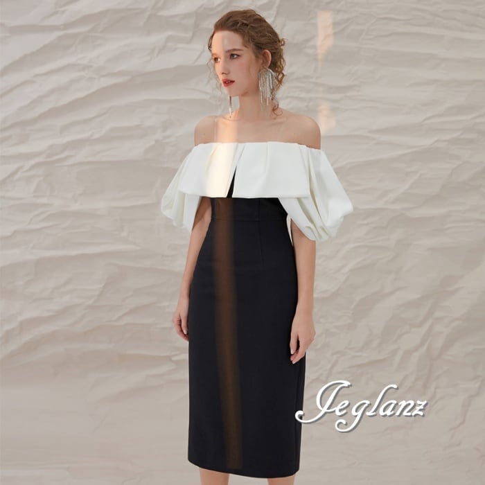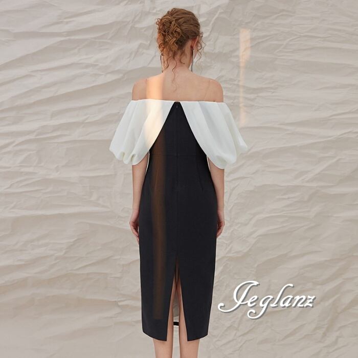 パーティ ドレス ワンピース 配色 オフショル フリル スリット入り ♪(M1248)ζ
