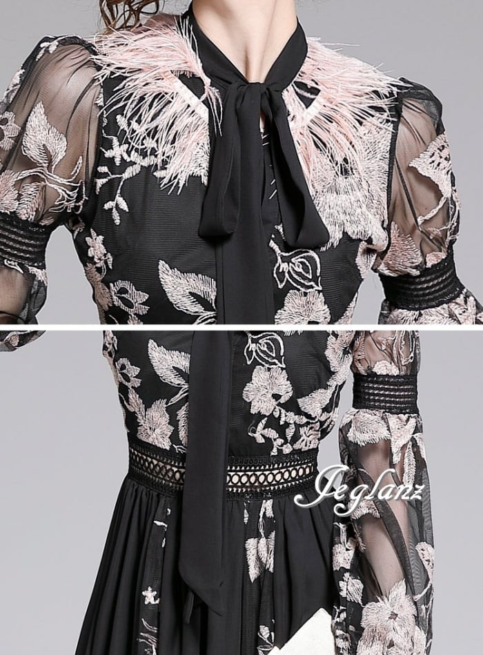 パーティドレス ワンピース ボウタイ 花柄 切替 Aライン シアー感 (M0470)ζ