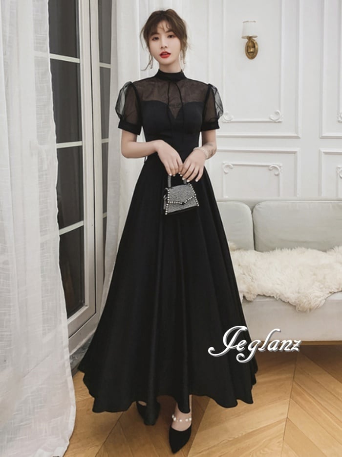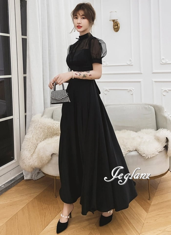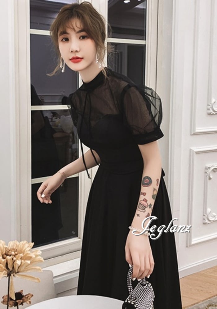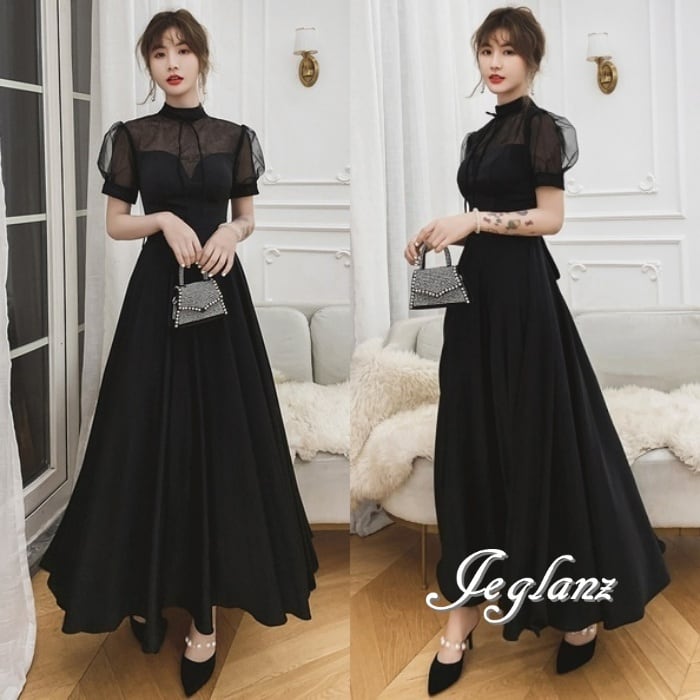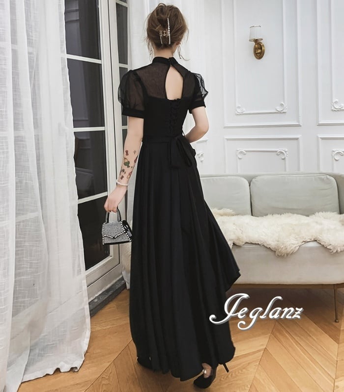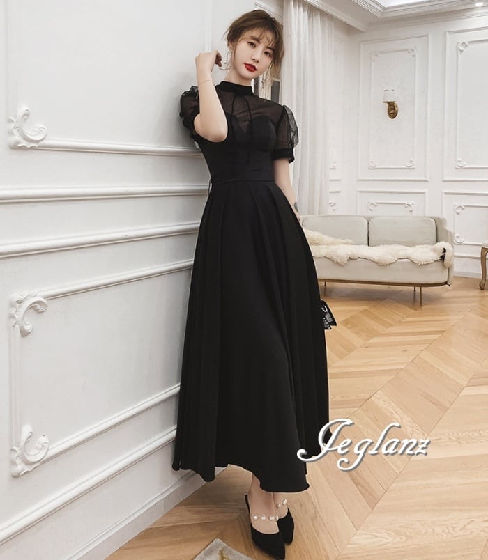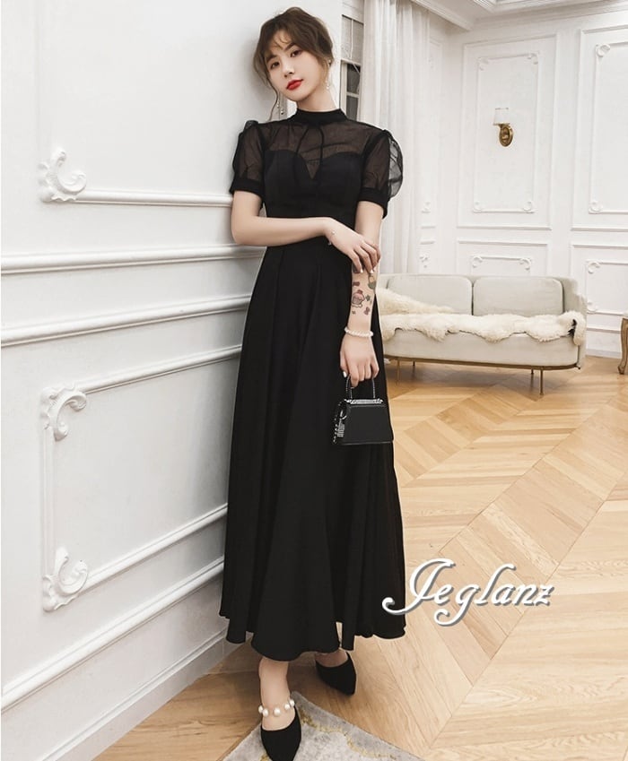 パーティ ワンピース ドレス 透け感 モックネック 共ベルト (M1230)ζ☆