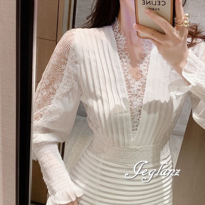 パーティ ドレス プリーツ ワンピース V開き 透け感 ボリューム袖 ♪(M2522)ζ