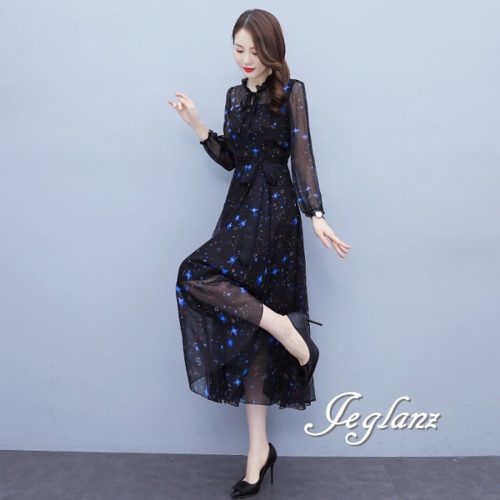 ロング丈 フリルカラー ワンピース ドレス 肌透け きれいめ 3色 (M3577)αγ