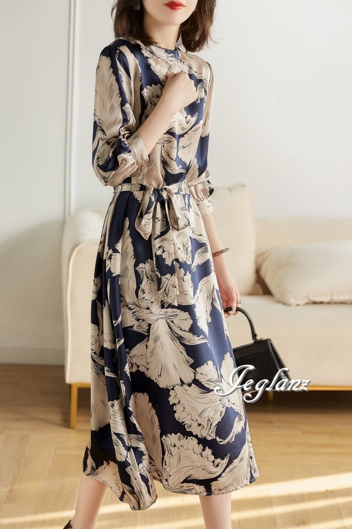 セミロング丈 ワンピース ドレス モックネック 共ベルト きれいめ 大人シック(M3629)γα