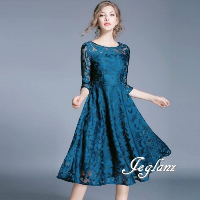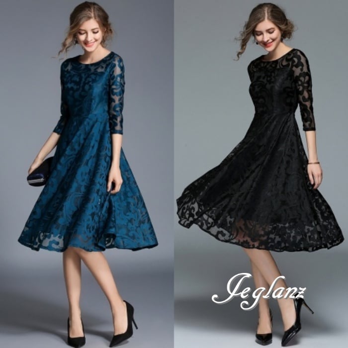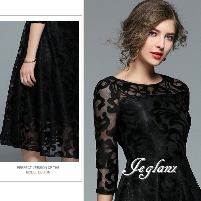 上品 セミロング丈 ワンピース ドレス ラウンドカラー 肌透け 7分袖 3色(M2779)ζ