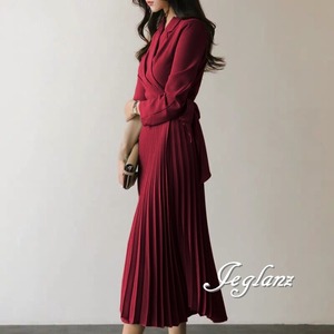 ワンピース ドレス Vネック 切替 プリーツ 共ベルト 細見え 3色 (M2845)γ☆