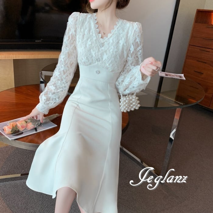 清楚 ワンピース ドレス Vネック スカラップ 切替 レース 肌透け エターナル(M2986)ζ