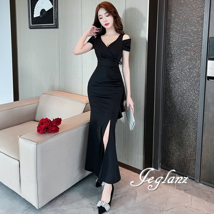 3色 パーティ ドレス オープンスリーブ ディープスリット 肌見せ (M4366)ζ