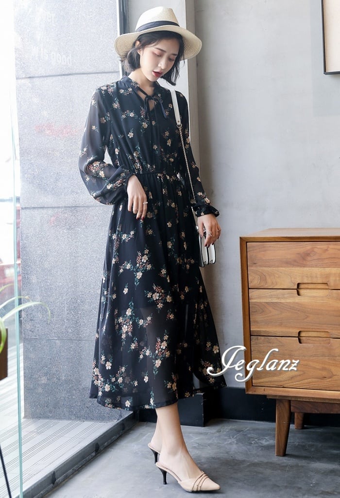 花柄 ロング丈 シフォン 切替 ワンピース スタンドカラー 肌透け(M4492)γα