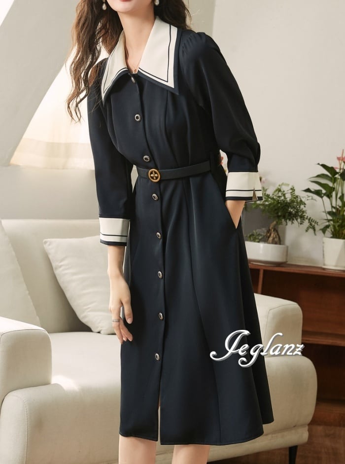 ワンピース ドレス 襟付き バイカラー ひざ丈 レトロ感 7分袖( M4503)ζ