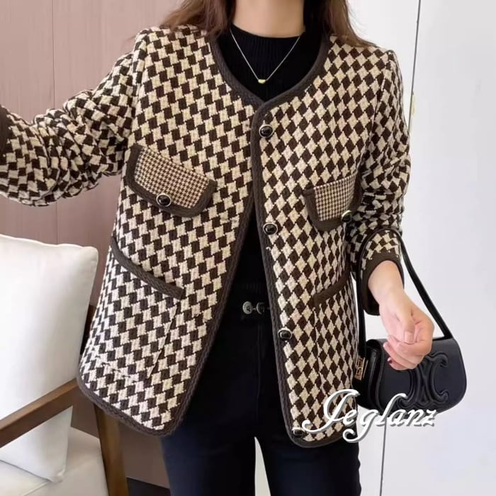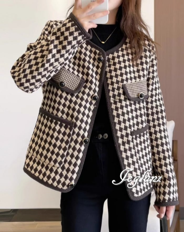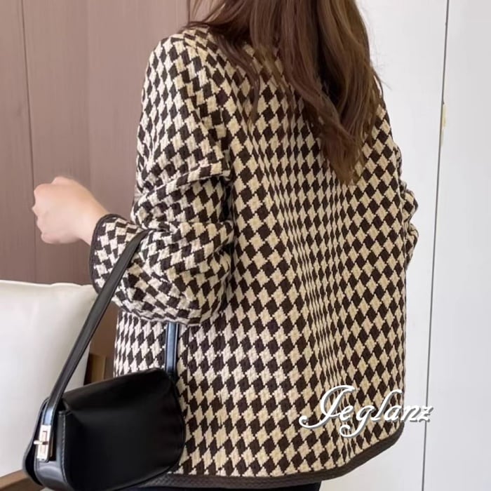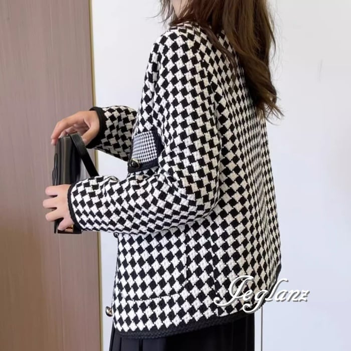 2色 ニット ジャケット チェッカーボード トリミング 高見え ♪(M4550)τ