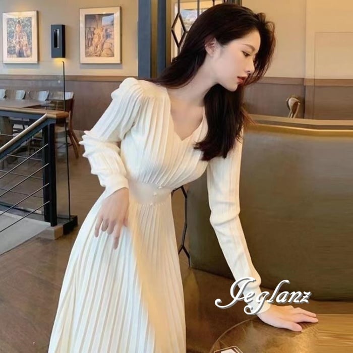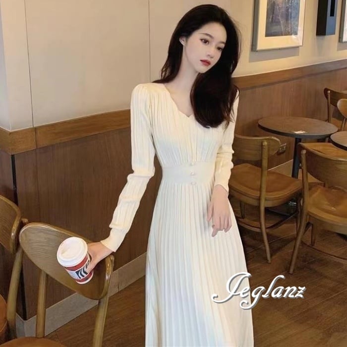 3色 ニット ワンピース Vネック プリーツ きれいめ シンプル派(M4602)γ