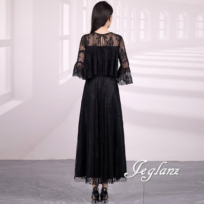総レース ロング丈 ワンピース ケープ 肌透け ベルスリーブ 高見え 4色(M4628)ζ