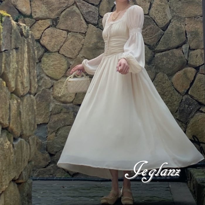清楚な印象を与えるボリューム袖のワンピースドレス