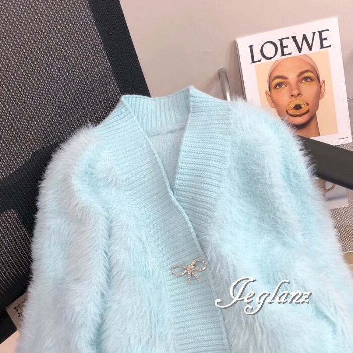 3色 シャギー ニット カーディガン リボン ボタン きれいめ シンプル派(M4661)σ,ς*