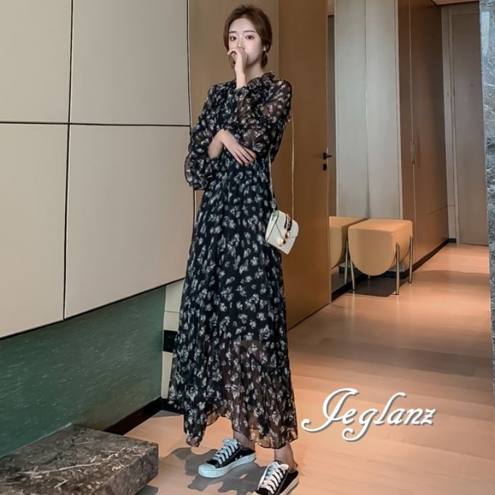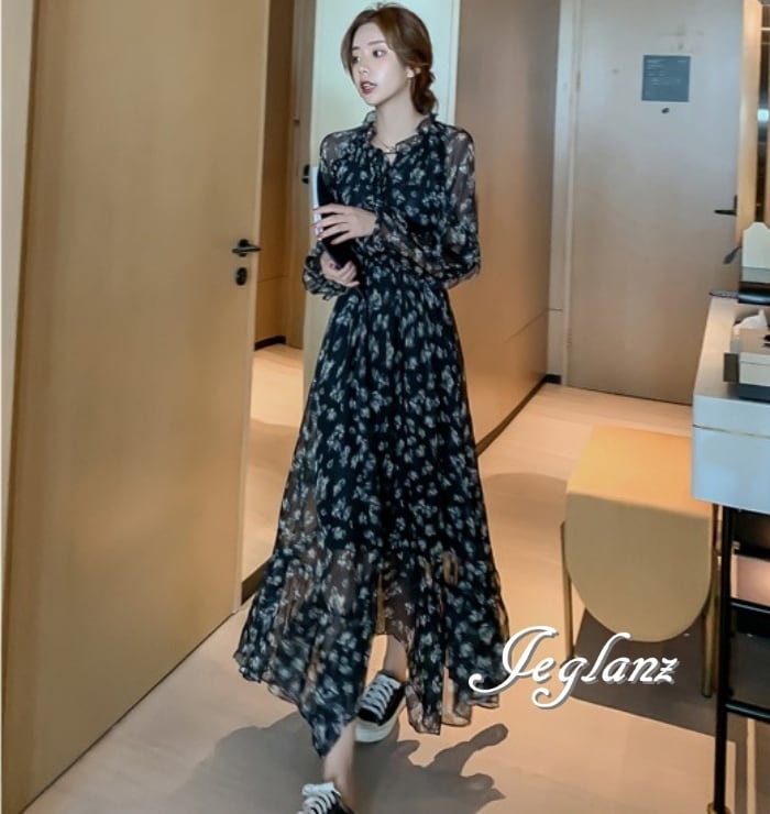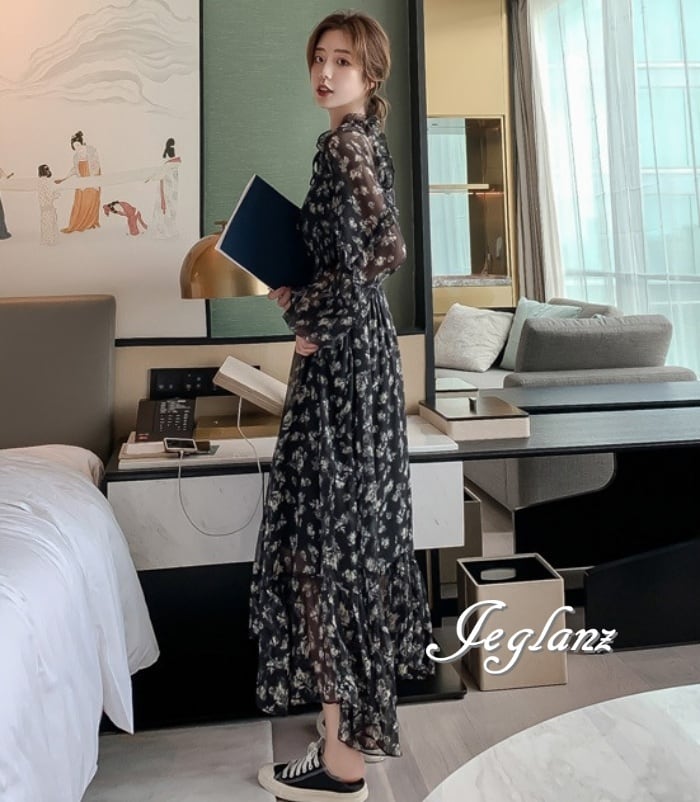 花柄 ロング丈 シフォン ワンピース フリル 肌透け きれいめ ♪( M4684)γα