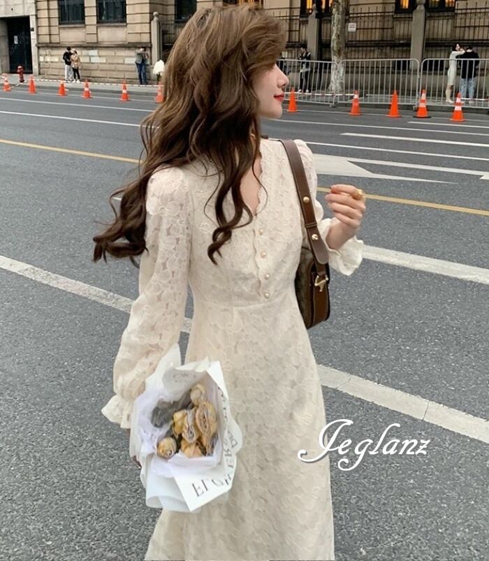 透かし彫り ワンピース ドレス スカラップ パール ボタン 高見え ♪(M4743)ζ