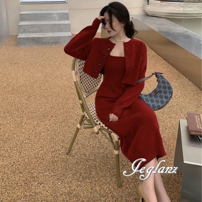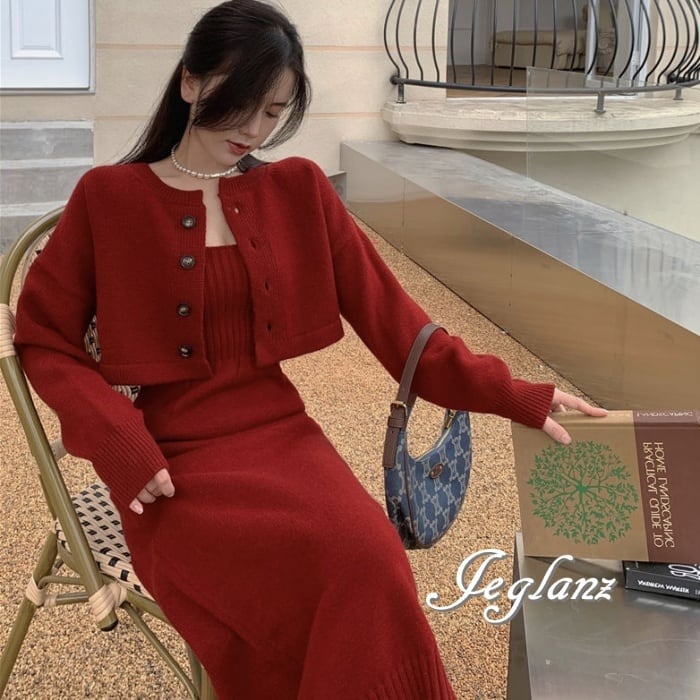 セットアップ 2点 ニット クロップド丈 カーディガン キャミ ワンピース 3色 (M4746)λ