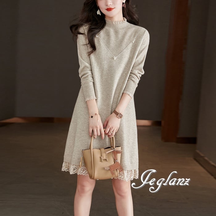 3色 パール付き ニット ワンピース 立ち襟 レイヤード きれいめ(M4748)γ