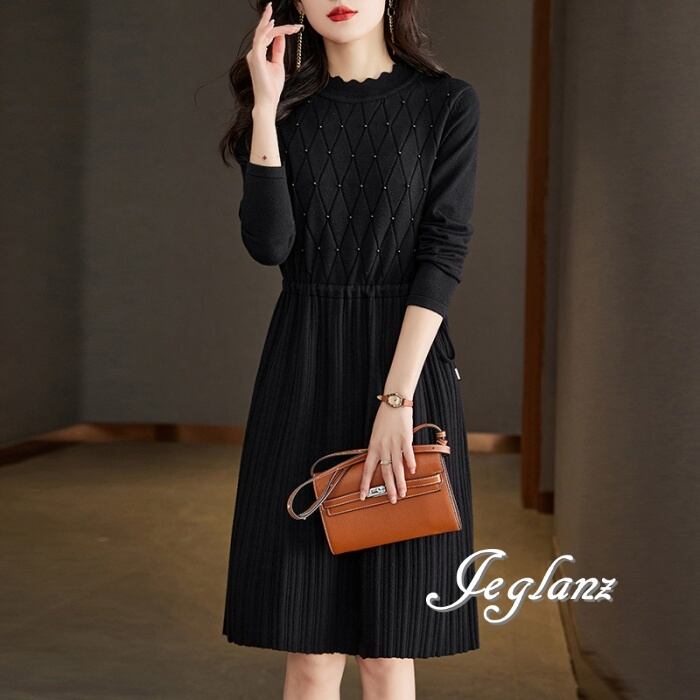 4色 ニット 切替 ワンピース ビジュー付き ひざ丈 ドロスト きれいめ( M4781)γ
