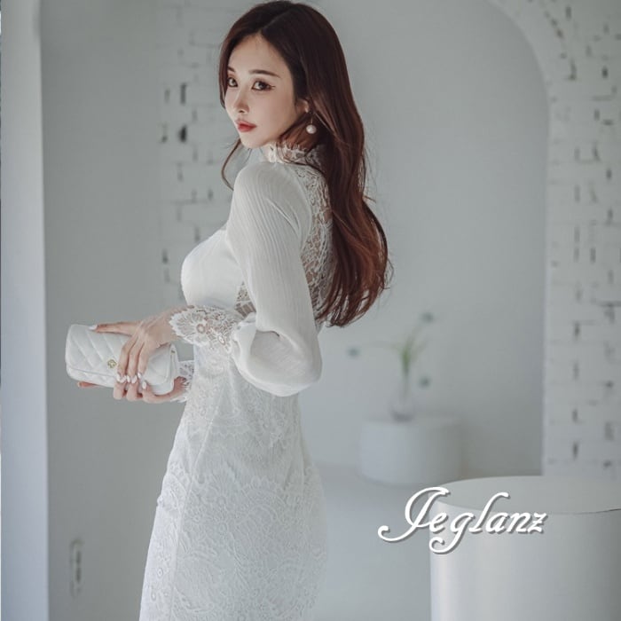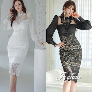 2色 パーティ ドレス ワンピース 立ち襟 レーシー タイト 着映え( M5050)ζ
