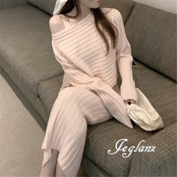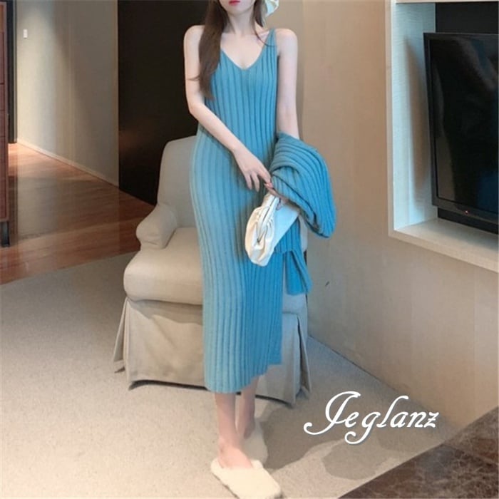 8色 セットアップ 2点 ニット 短め丈 トップス 袖なし タイト ワンピース ♪ (M5220)μ