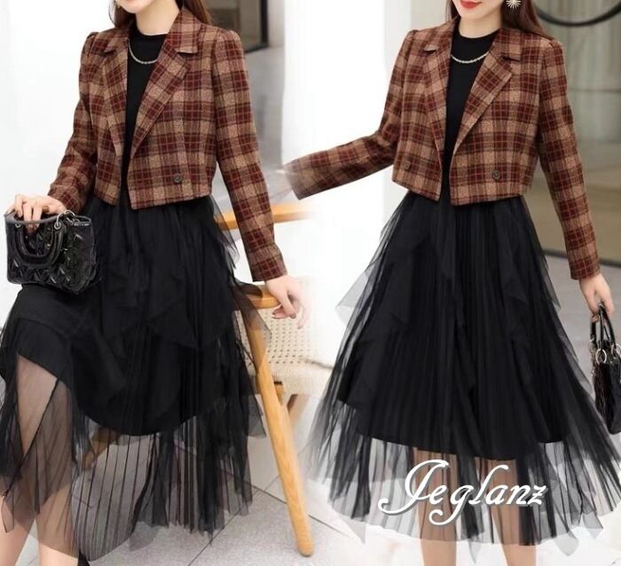 セットアップ 2点 ニット 短め丈 ジャケット 7分袖 ワンピース 2色( M5308)λ