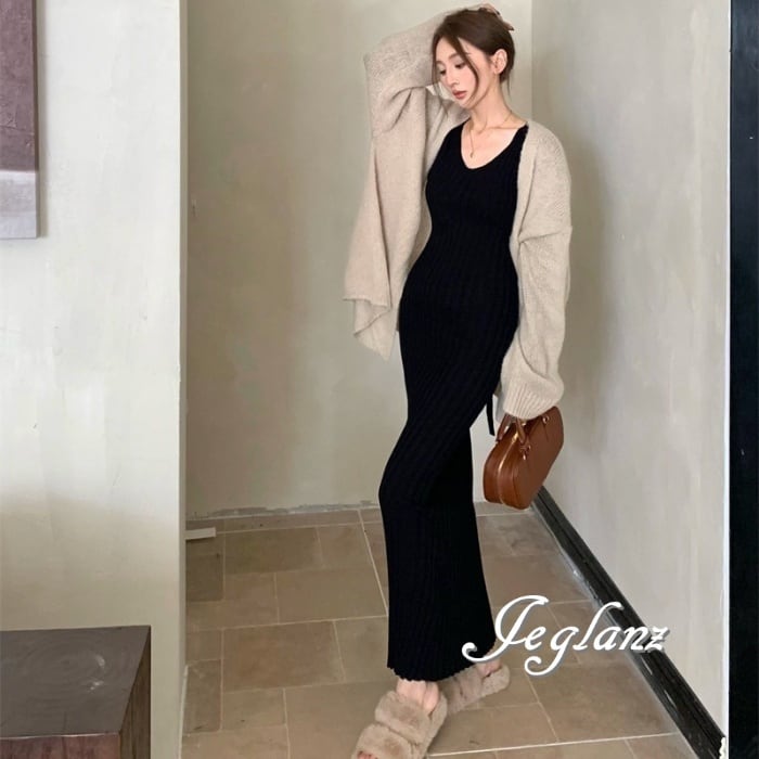 マキシ丈 プリーツ ワンピース ニット Vネック きれいめ シンプル派 2色(M5321)γ