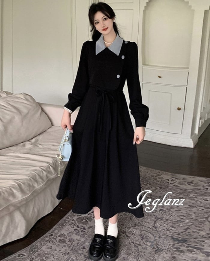 襟付き ワンピース ドレス バイカラー 紐ベルト 大きいサイズ ♪( M5344)