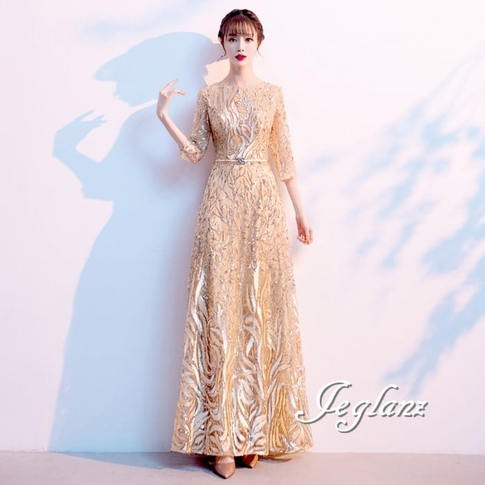 3色 パーティ イブニングドレス モチーフ ラメ キラキラ 光沢感 5分袖( M5351)ζ