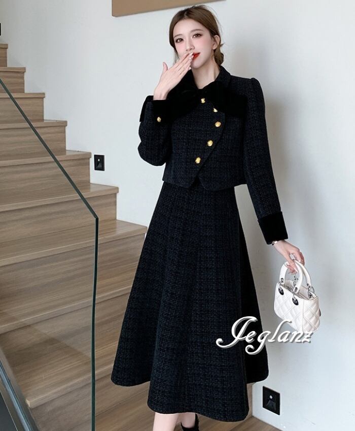 セットアップ 2点 短め丈 ツイード リボン付き ジャケット Aライン スカート (M5575)μ