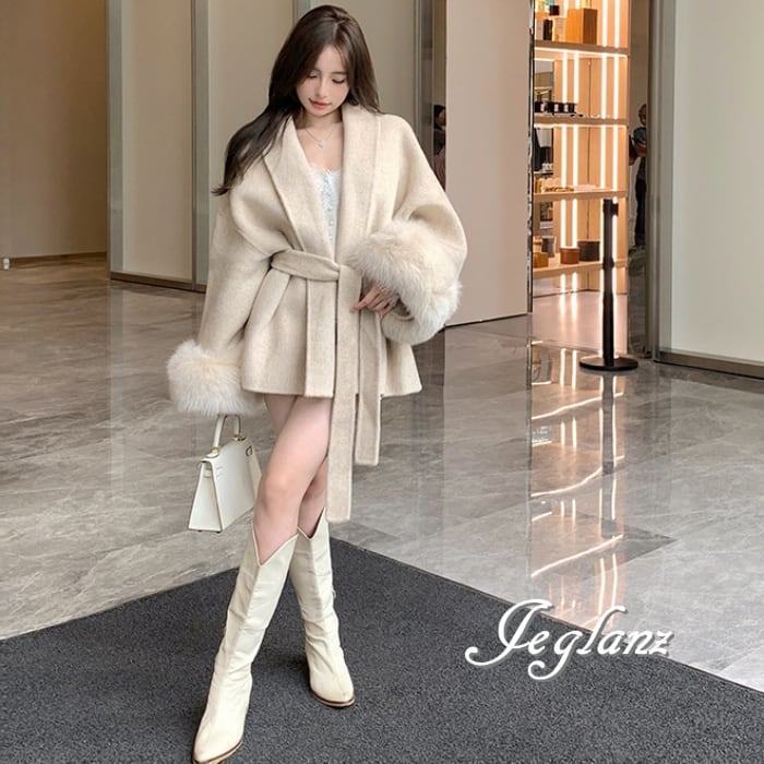 ハーフ丈 ニット コート 襟付き ボリュームファー 共ベルト 2色(M5663)τ