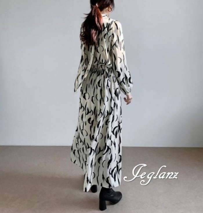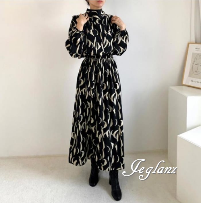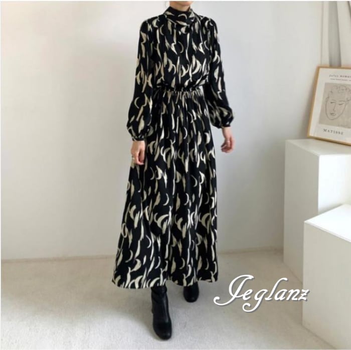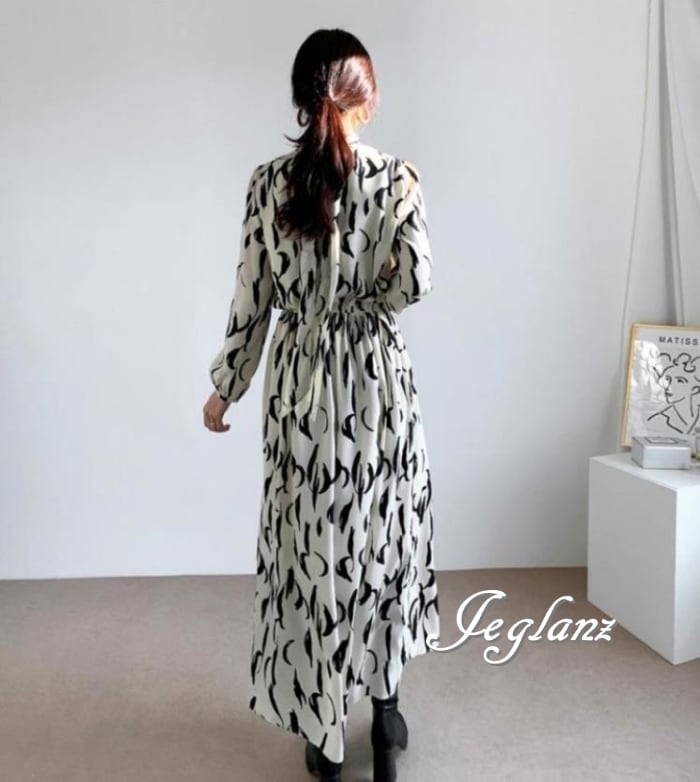 2色 マキシ ワンピース ドレス モックネック 背中リボン モノトーン(M5742)γα
