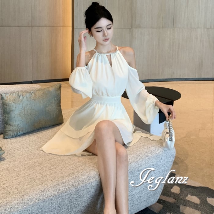 パーティドレス ワンピース ビジュー付き オープンショルダー 立体 レイヤード 2色(M5779)ζ