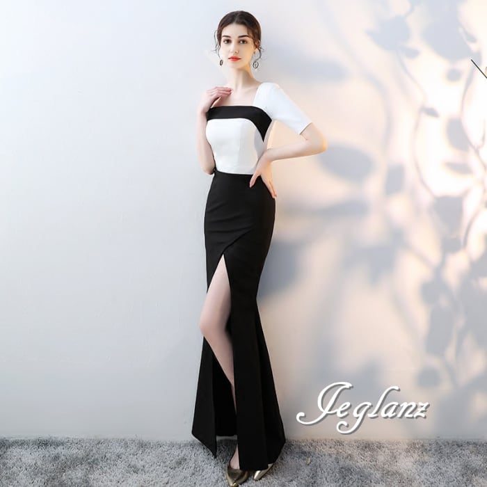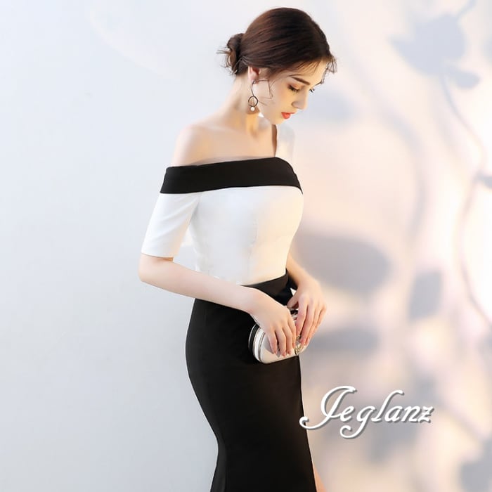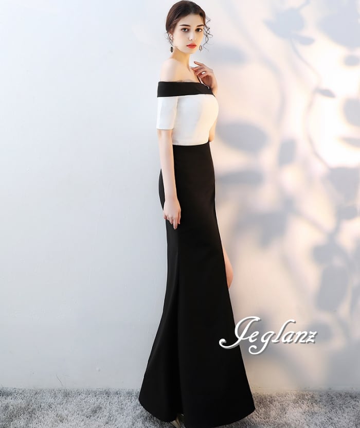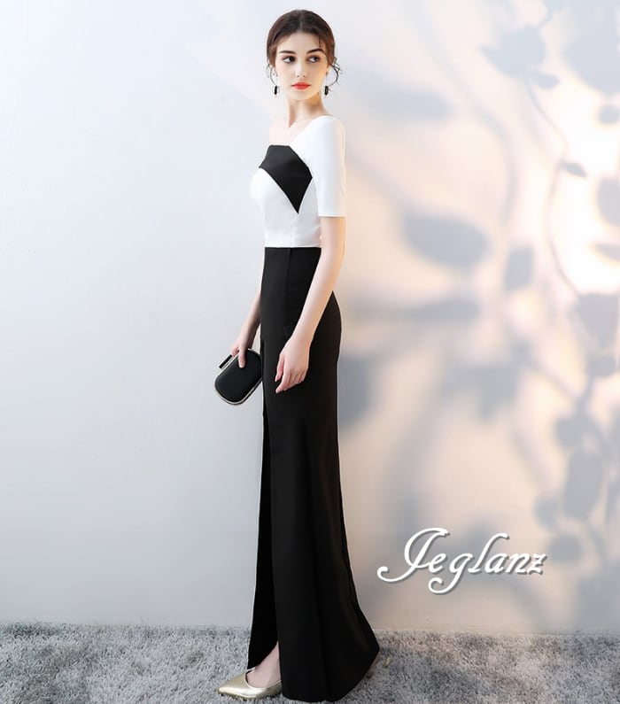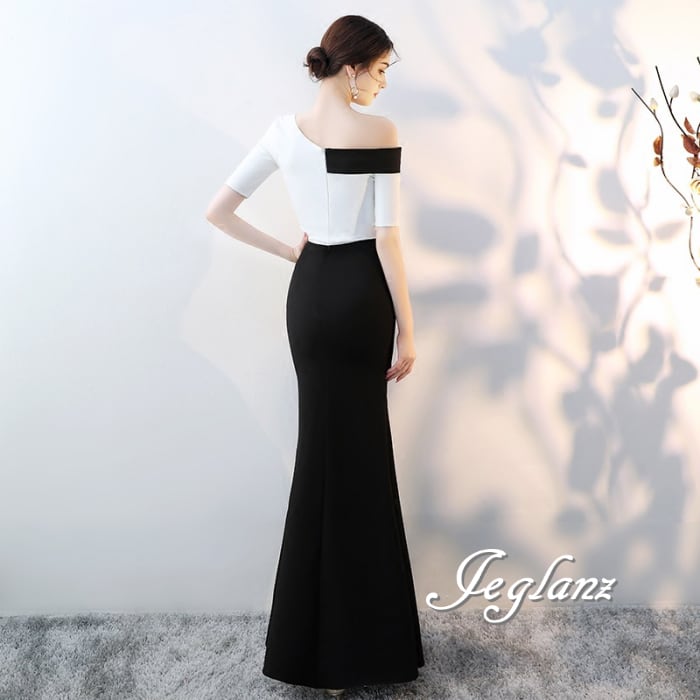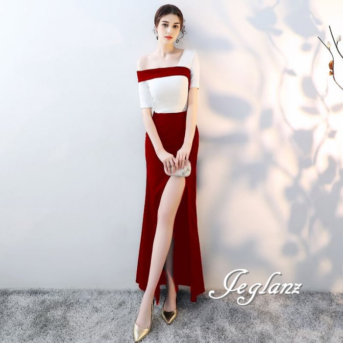 3色 パーティ イブニングドレス ブロッキング ワンショル スリット入り(M5786)ζ