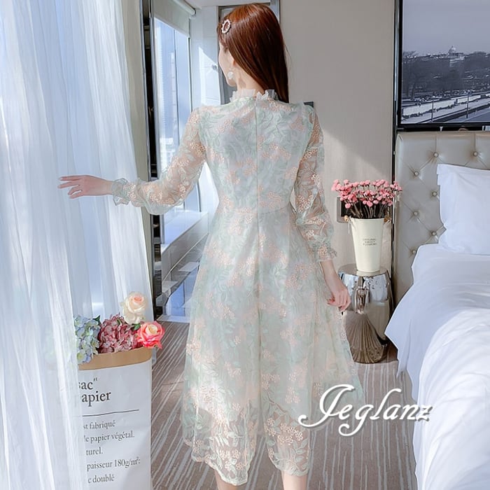パーティ ワンピース ドレス スカラップレース フリル 立ち襟 レーシー(M5907)★ ζ