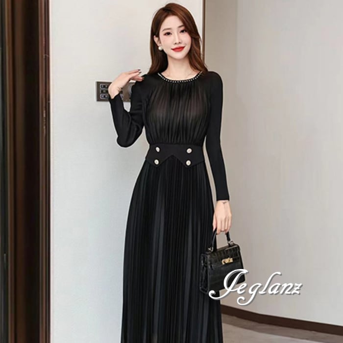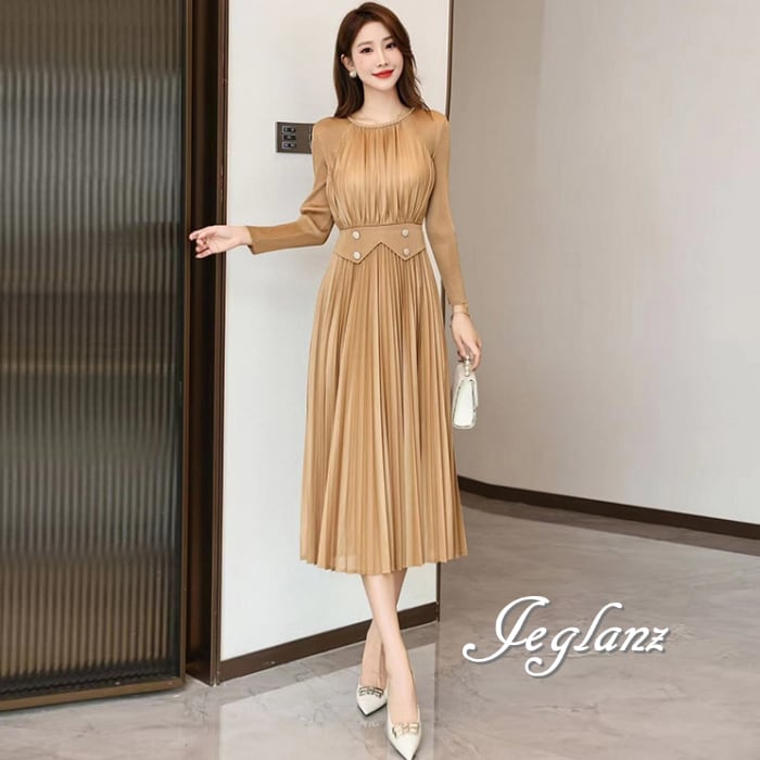 4色 プリーツ ワンピース ドレス 切替 Aライン きれいめ 細見え(M5959)ζ