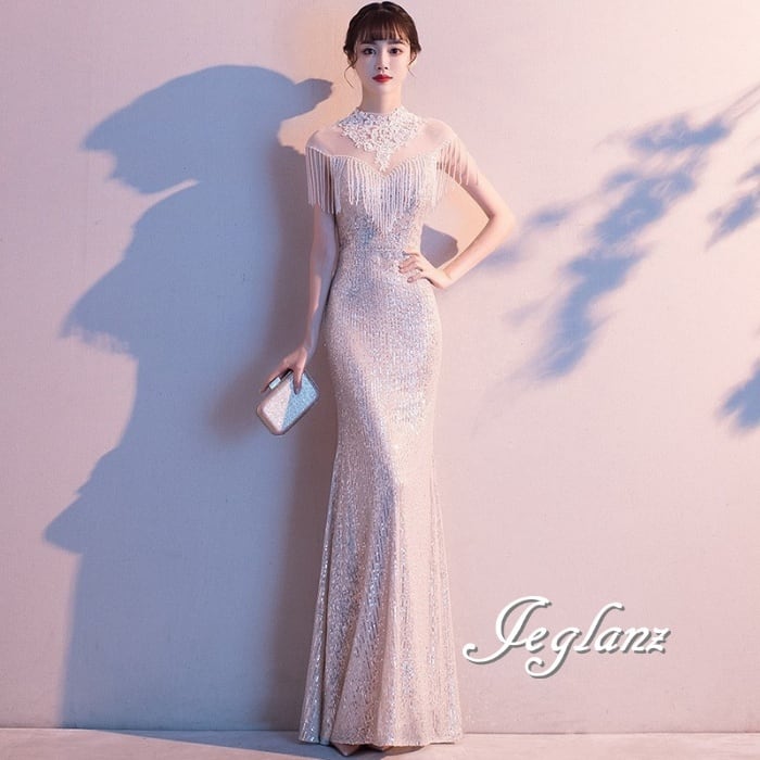 7色 パーティ イブニングドレス フリンジ タッセル 透け感 キラキラ 光沢感(M6054)ζ