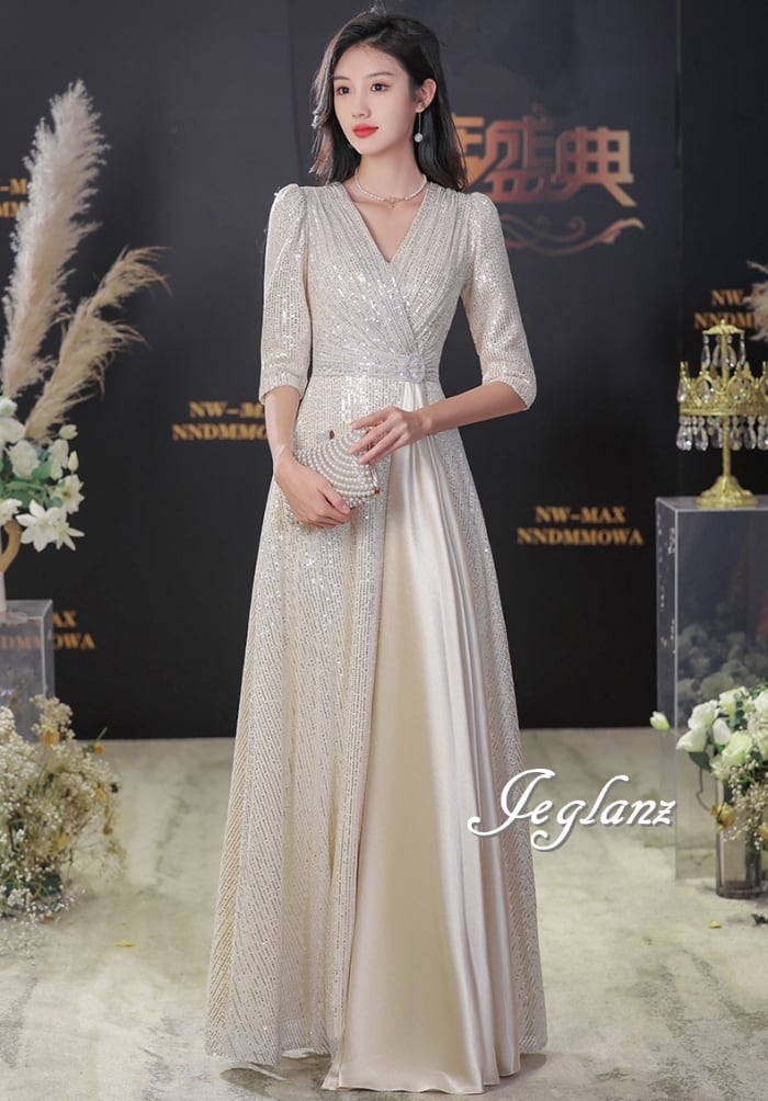 2色 パーティイブニングドレス 異素材 キラキラ ラメ 光沢感 7分袖 ♪( M6071)ζ