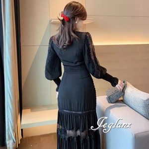 ワンピース ドレス Vネック 切替 プリーツ レーシー 肌透け 2色 ♪ (M6101)ζ☆