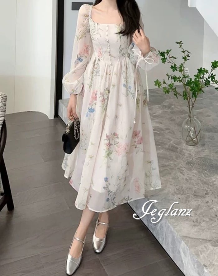 花柄 ワンピース ドレス スクエアネック Aライン 肌透け上品 ♪(M6102)α